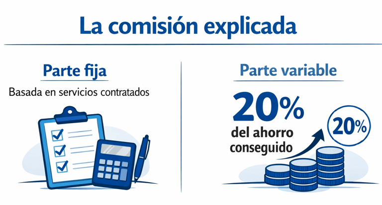 La provisión de fondos (se resta de la parte fija) se paga con la firma del contrato. El resto se paga después de finalizar los servicios: remanente de la parte fija + variable según el ahorro conseguido.